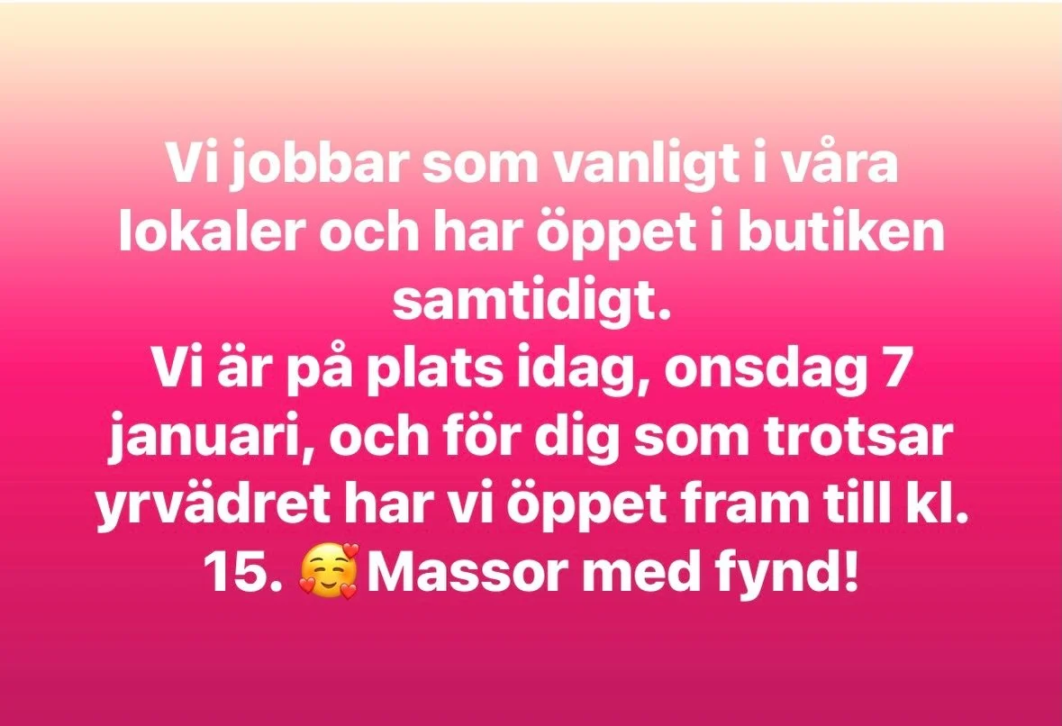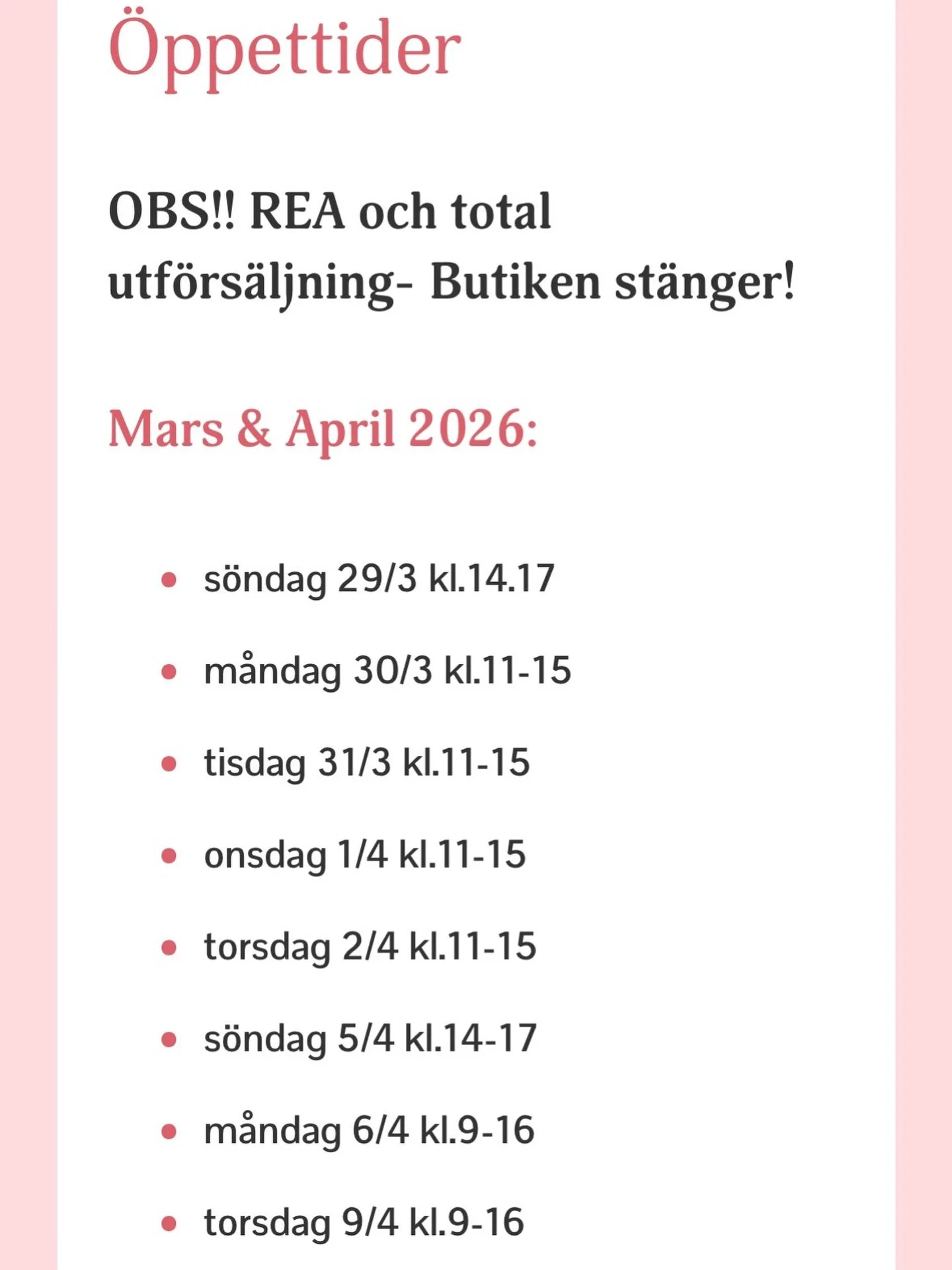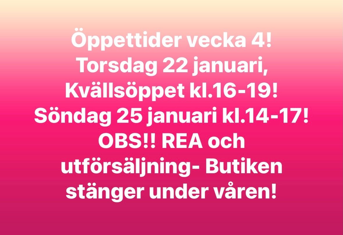 Våra öppettider kan variera från vecka till vecka beroende på hur mycket vi är på plats. De aktuella tiderna för de kommande veckorna hittar du alltid under fliken "Öppettider". Är du osäker på om vi har öppet, ring oss gärna på 070-273 40 40 innan du kommer, särskilt om du reser långväga. Om du vill boka VIP-shopping för dig och dina vänner, där ni får hela butiken för er själva i 2 timmar, är ni varmt välkomna att kontakta oss så hittar vi en tid som passar er!